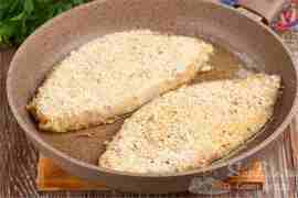 Затем окунаем во взбитые яйца (2 шт.) и обваливаем в хлебной крошке (хлеб измельчаем в блендере). Обжариваем в масле на слабом огне с 2 сторон по 10 минут. Получается 4 больших шницеля.