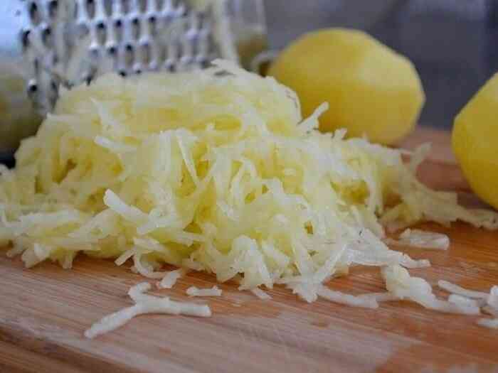 Картофель очистить от кожуры и и натереть на крупной терке. Чтобы тертая картошка не успела потемнеть, необходимо сразу же перемешать ее со сметаной.