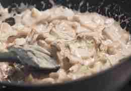 Когда грибы поджарились, добавим сметаны и немного протомим.