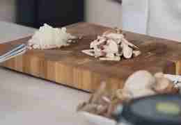 Для начала для рагу нарежем репчатый лук и грибы.