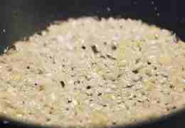 Обжарим лук до золотистого цвета на растительном масле, а затем к нему добавим и грибов, посолим, поперчим.