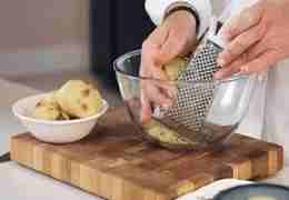Печеный картофель нужно очистить от кожуры и натереть на крупной терке.