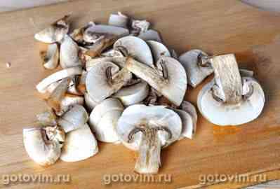 Грибы можно взять любые. Я взяла шампиньоны, как более доступные в любое время года. Режем мелко промытые и обсушенные на бумажном полотенце грибы.