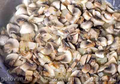 Обжариваем грибы с луком на растительном масле до готовности, солим по вкусу и оставляем остывать.