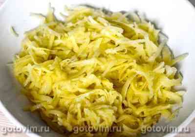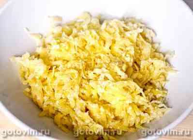 Приготовим фарш для зраз. Картофель будем использовать для него сырой. Натираем очищенный сырой картофель на терке.