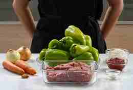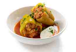 Привычный нам с детства вариант с мясом, рисом и рыжей, подкрашенной томатной пастой подливкой. В духовке, погруженные в бульон, перцы и начинка обмениваются соками друг с другом, а при подаче к ним присоединяется еще и сметана с ее приятной молочной кислинкой, которая собирает воедино тот самый, знакомый с детства вкус. Важный момент: в кастрюле перцы должны не лежать, а стоять фаршем вверх, плотно друг к другу. Тогда и вся начинка останется внутри, и приготовятся перцы более равномерно.