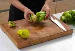 Помыть перцы. Отрезать у них верхушку и удалить семена.
