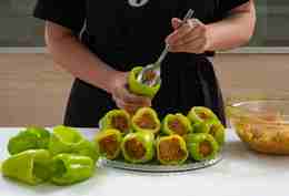 Заполнить перцы фаршем, чуть не доходя до краев.
