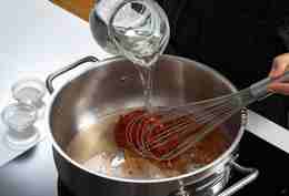 В кастрюле смешать 700 мл воды, томатную пасту и сахар. Посолить по вкусу.
