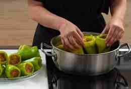 Выложить перцы, накрыть крышкой и поставить на средний огонь. Тушить около 40 минут после закипания.