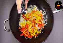 Лук нарежьте полукольцами. Болгарский перец – тонкими полосками или небольшими кубиками. Если креветки с хвостиками, очистите их. Промокните бумажным полотенцем, чтобы убрать лишнюю влагу.