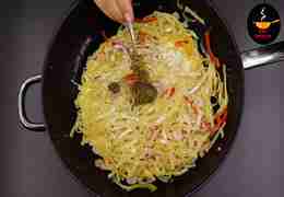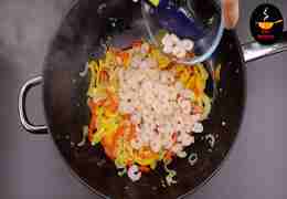 Отправьте креветки к овощам. Обжаривайте их буквально по минуте с каждой стороны до изменения цвета.