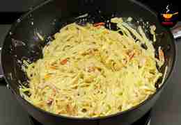 сковороду. Если макароны крупные и сливки их не покрывают полностью, добавьте 50-100 мл горячей воды.