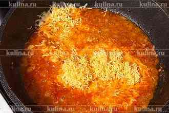 Сыр натереть на мелкой терке, выложить в сковороду, еще раз все перемешать, чтобы сыр равномерно расплавился.