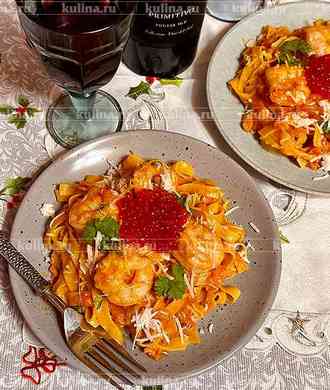 Переложить пасту с соусом на тарелки. Украсить блюдо тертым пармезаном, листиками петрушки, в центр выложить икру. Подать пасту к столу. Приятного аппетита!