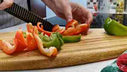 Болгарский перец просто чистим и изображаем из него кусочки размером с уже нарезанные помидоры. Не обязательно точь-в-точь.