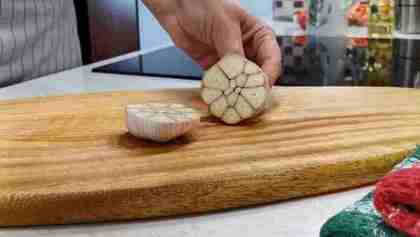 Теперь чеснок. Берем целую головку чеснока. И не скромненькую, а покрупнее. Разрезаем головку поперек. И никакой чистки! Режем прямо в шелухе.