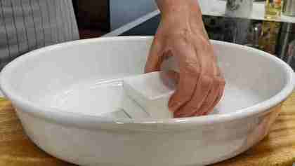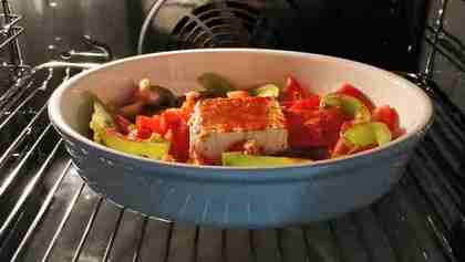 Берем сыр фета в картонной упаковке. Вскрываем коробку, аккуратно вынимаем сырный квадратик и кладем его в центр формы для запекания. Ничем смазывать форму не нужно.