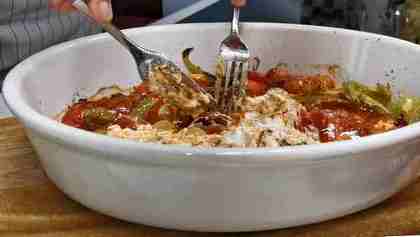 Вынимаем запеченную заправку из духовки. Берем вилочку и начинаем проминать овощи и размешивать сыр. Да! Сыр именно размешивать, потому что он внутри,