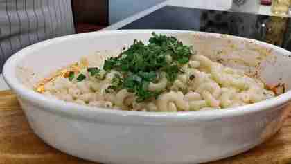 Перемешиваем овощи с сыром и выкладываем в форму наши вареные макароны. А сверху зелень. В идеале петрушку.