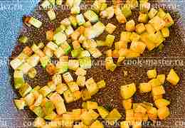 Кабачок (если молодой, то можно не чистить) нарезать мелким кубиком. В сковороде разогреть растительное