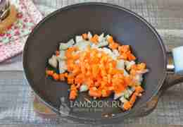 Морковь нарежьте или натрите и выложите в сковороду к луку, обжарьте до мягкости на среднем огне.