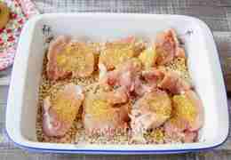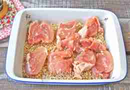 В жаропрочную форму или латку выложите перловую крупу, разровняйте. Мясо курицы нарежьте на куски и выложите на перловку.
