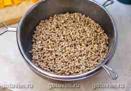 Перловку промыть, залить холодной водой и оставить на ночь, чтобы на следующий день крупа быстрее приготовилась. Перед началом готовки, откинуть перловку на дуршлаг, чтобы вода стекла.