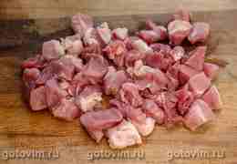 Мясо вымыть, обсушить на бумажном полотенце и порезать небольшими кусочками, как на фото.