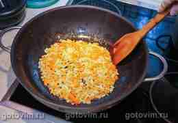 В казане, воке или любой другой глубокой сковороде с толстым дном и стенками разогреть растительное масло, пассеровать до мягкости лук, посолить, приправить молотым кумином.