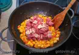 и добавить нарезанное кусочками мясо. Обжаривать мясо, помешивая, до появления на нем корочки. Сейчас нам не надо доводить мясо до готовности, а только «запечатать» кусочки, чтобы они сохранили сок.