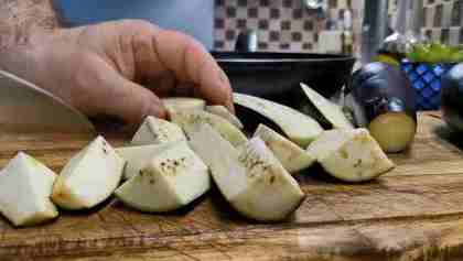 Баклажаны режем крупным кубиком. Кожицу с них счищать необязательно. Даже если они взрослые и очень крупные, а не как тут у меня,