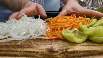 Лук нарезаем полукольцами. Морковь настругиваем тонкой соломкой. Перец режем крупными кусочками.