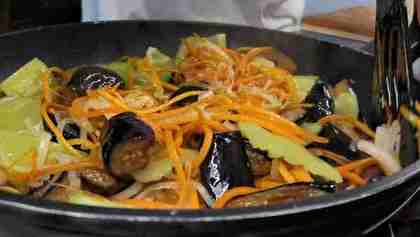 Затем выкладываем к баклажанам всё остальное (перец, морковку, лук). И уже теперь обжариваем всё вместе 7-8 минут.