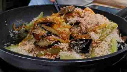 Как приготовился рис, снимаем сковороду с огня. Если рис в серединке сковороды идеальный, а по краям и у самого верха чуть суховат (такое может быть),