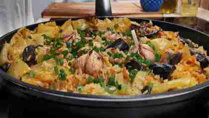 Подавать такой плов особенно вкусно с зеленым луком и тонкими кружочками спелых помидоров. Это, скажу я вам, самая что ни на есть восточная классика.