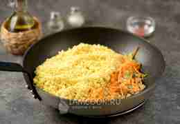 Пшено промойте несколько раз до чистой воды, добавьте к овощам в сковороду.