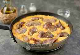 Дальше выложите на пшено печень, слегка утопите ее в кашу, при необходимости добавьте еще немного воды и продолжайте готовить блюдо под плотно закрытой