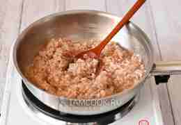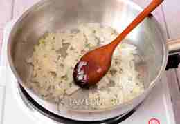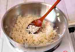 Затем всыпьте сухой рис и продолжайте обжаривать его вместе с луком ещё около минуты, постоянно помешивая, чтобы рис