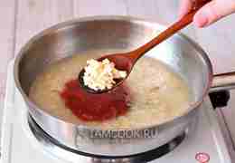 Далее влейте воду, посолите по вкусу и добавьте пару ложек ткемали. Соус уже содержит какое-то количество соли, поэтому не пересолите.