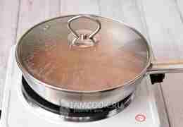 Всё перемешайте, дождитесь закипания и убавьте огонь до минимума. Накройте сковороду крышкой и готовьте рис до мягкости. По времени на это уйдёт