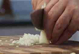 Репчатый лук очистите от шелухи и нарежьте мелким кубиком со стороной 3-4 мм. Чеснок раздавите плоской стороной ножа, очистите от кожицы и мелко нарубите.