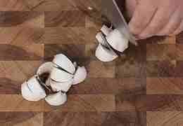 Шампиньоны тщательно очистите влажной бумажной салфеткой, снимите верхний слой кожицы. Разделите грибы на две равные части.