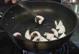 В сковороде разогрейте 2 столовые ложки растительного масла на сильном огне. Обжарьте крупно нарезанные шампиньоны до золотистой корочки и