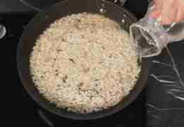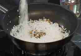 Всыпьте рис арборио, обжаривайте 30 секунд при постоянном помешивании.