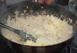 Полутвердый сыр натрите на мелкой терке. Половину сыра добавьте в горячее ризотто.