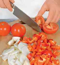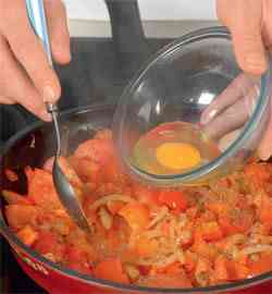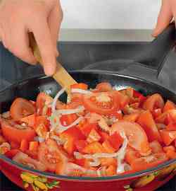 Разогреть масло и обжарить лук и перец, 5 мин. Добавить помидоры, чеснок, паприку, соль и перец и тушить, время от времени перемешивая, 5 мин.