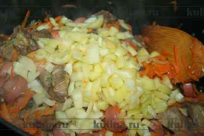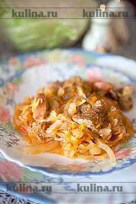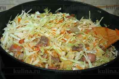 Капусту нашинковать и выложить в кастрюлю, перемешать с мясом и овощами, закрыть крышкой и тушить до мягкости, периодически перемешивая.