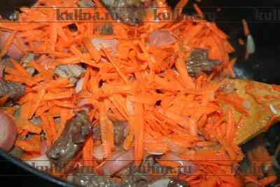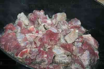 В гусятнице разогреть масло, выложить и мясо и обжарить его до золотистого цвета. (Если мясо дало много сока, жидкость слить, но не выливать.