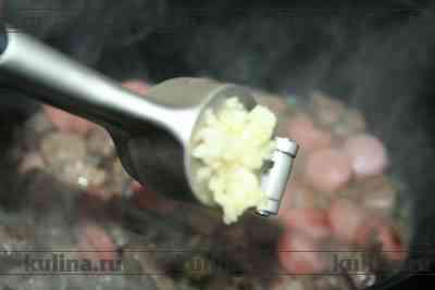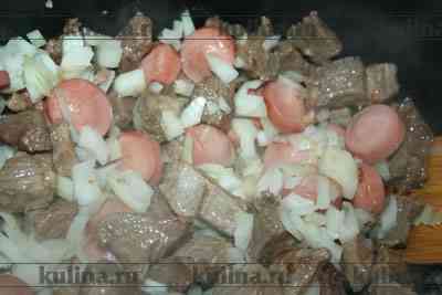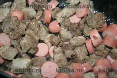 Когда мясо будет готово, немного подсолить его по вкусу. Сосиски нарезать кружочками и когда мясо обжарится, выложить в гусятницу. Перемешать.